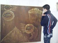 evento en las cuevas del Rodeo exposicion individual ,junio año 2008,en la foto se muestra una de las obras que presente para el evento ,obra trabajada en lona , con pinturas imitacion a chapa oxidada y cargas matericas.